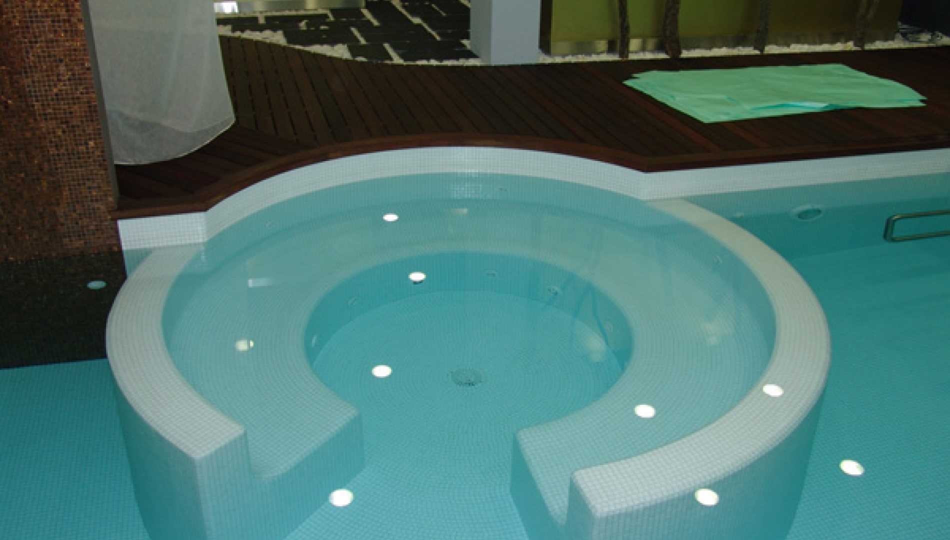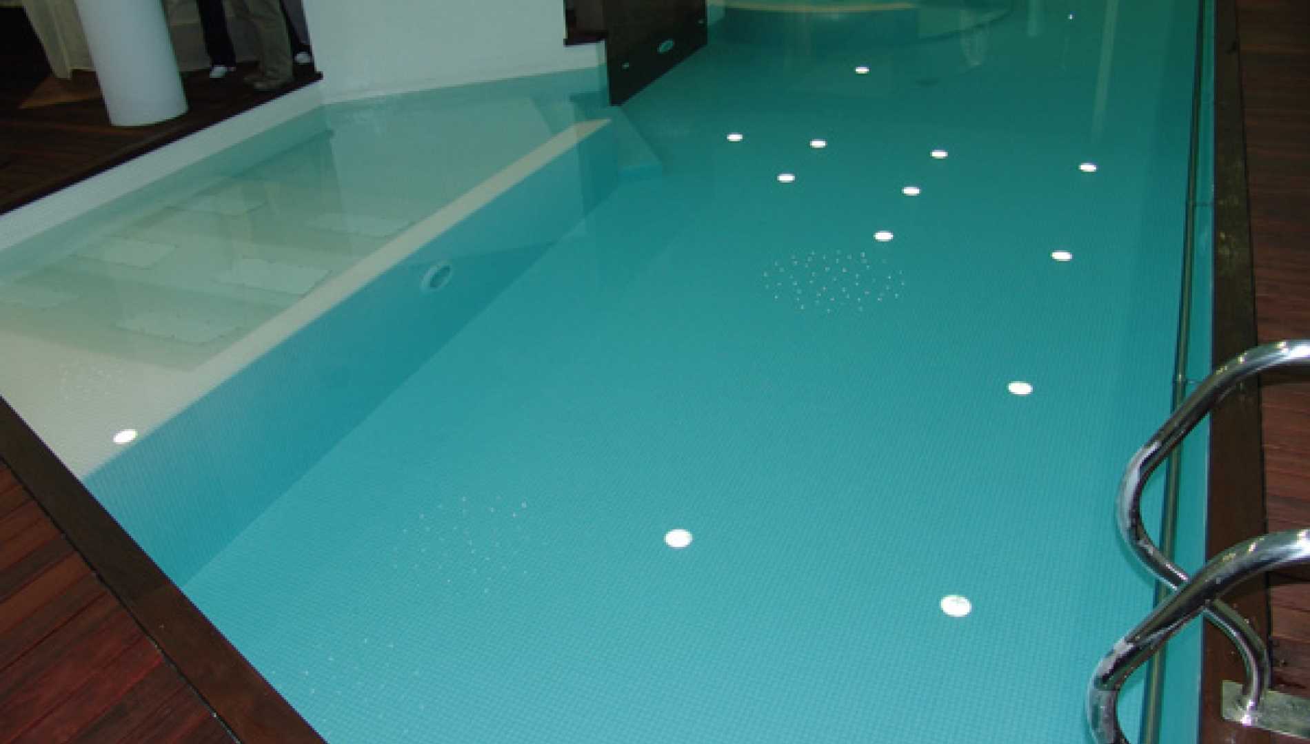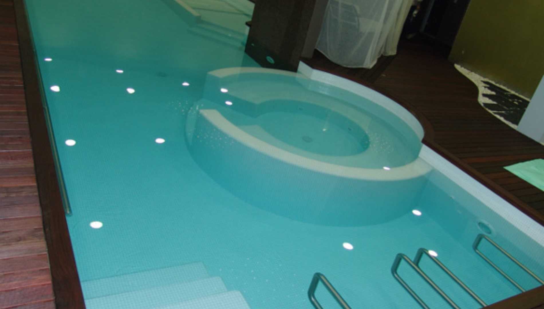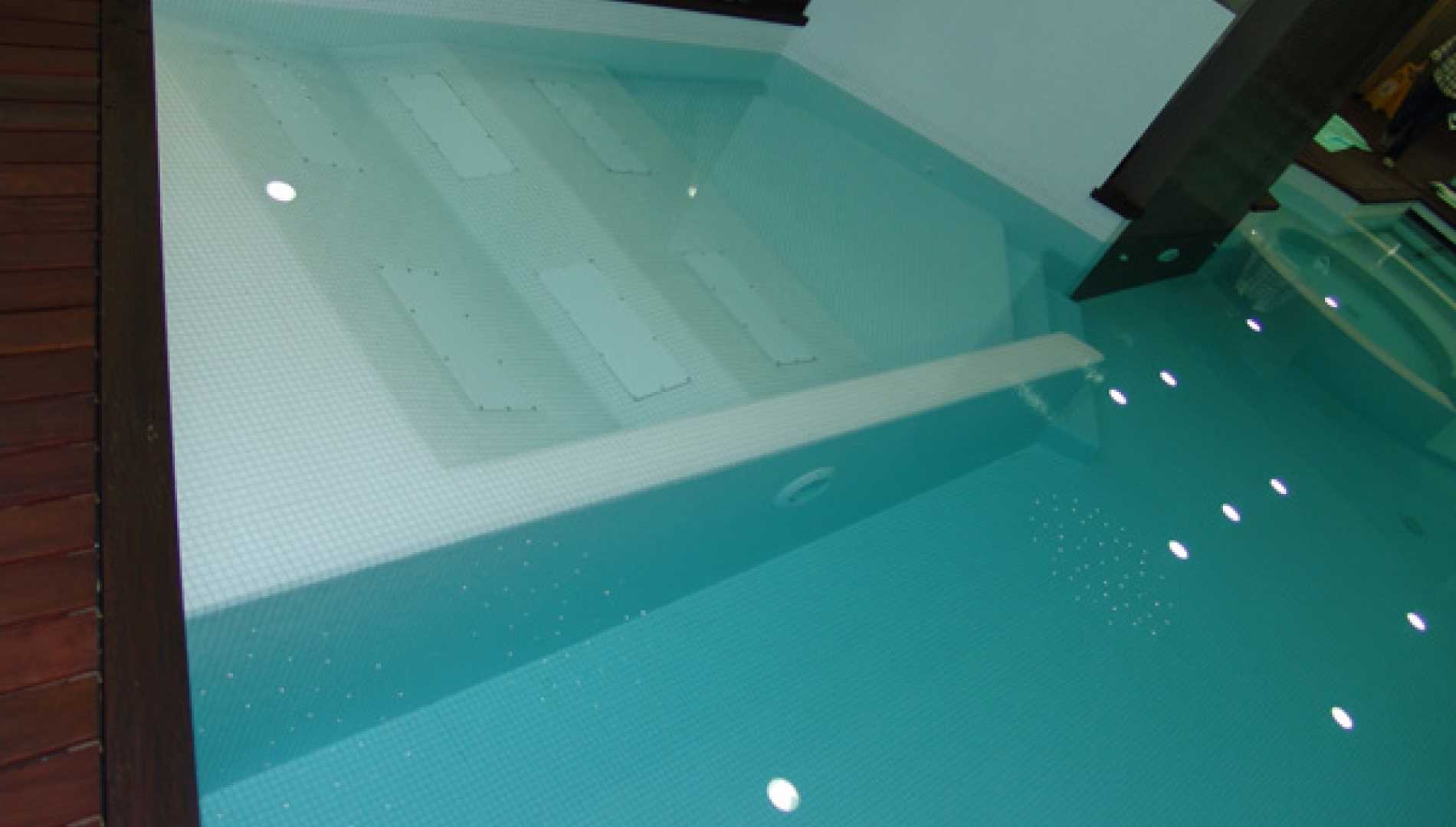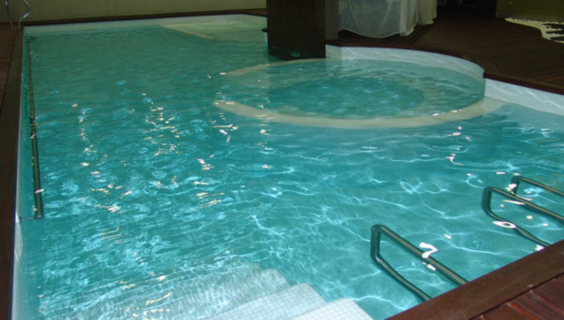 Piscina interior, construída em Betão Projectado, com 44 m2, de Skimmers e de água aquecida, tendo sido concebida para a tornar numa piscina de Health Club. Revestimento a mosaico de vidro branco. Equipamento de filtragem e desinfecção Astralpool, com cascata, bomba de contra corrente, "cama de água", banheira de hidromassagem e três focos de iluminação.