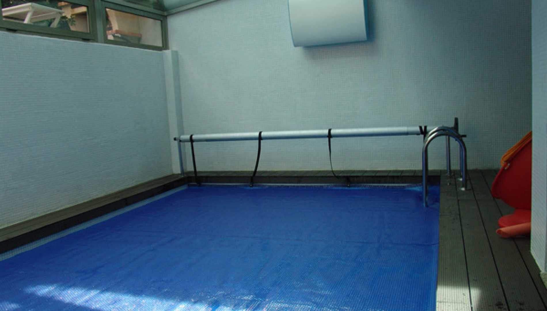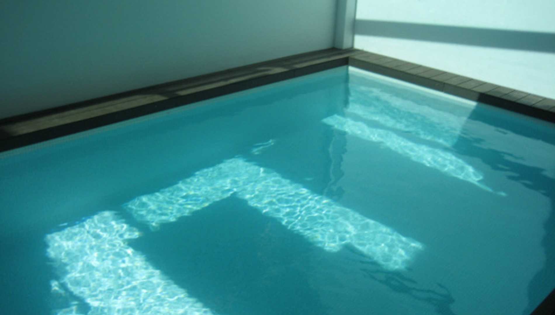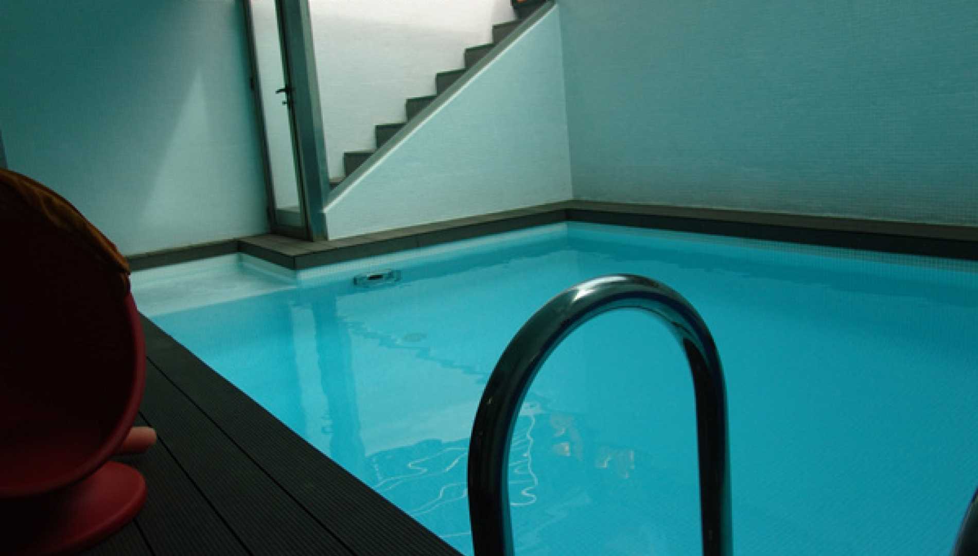 Piscina interior, construída em Betão Projectado, com 15 m2, de Skimmers. Revestimento a mosaico de vidro branco. Equipamento de filtragem e desinfecção Astralpool, com Bomba de Contra Corrente e um foco de iluminação.