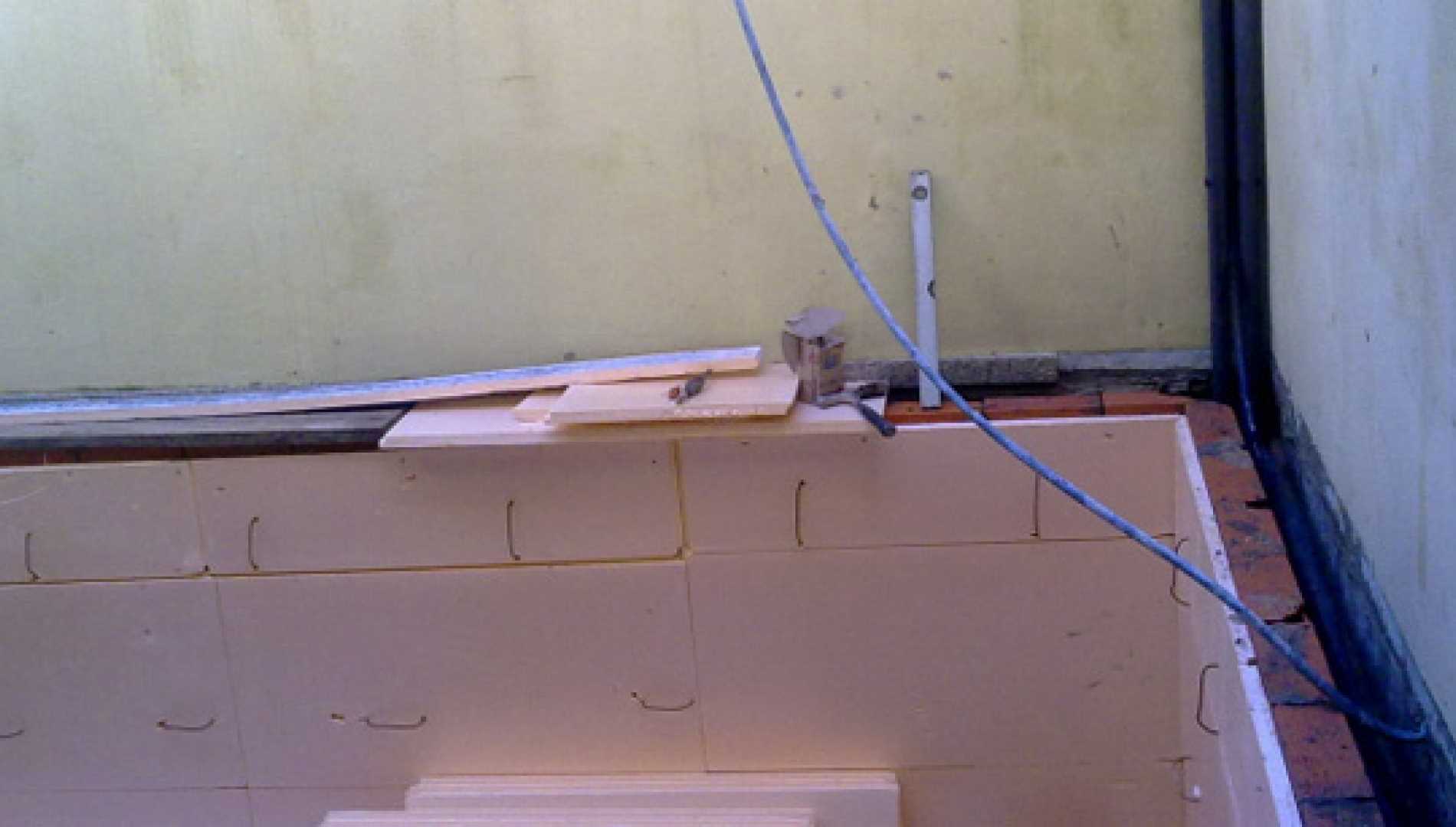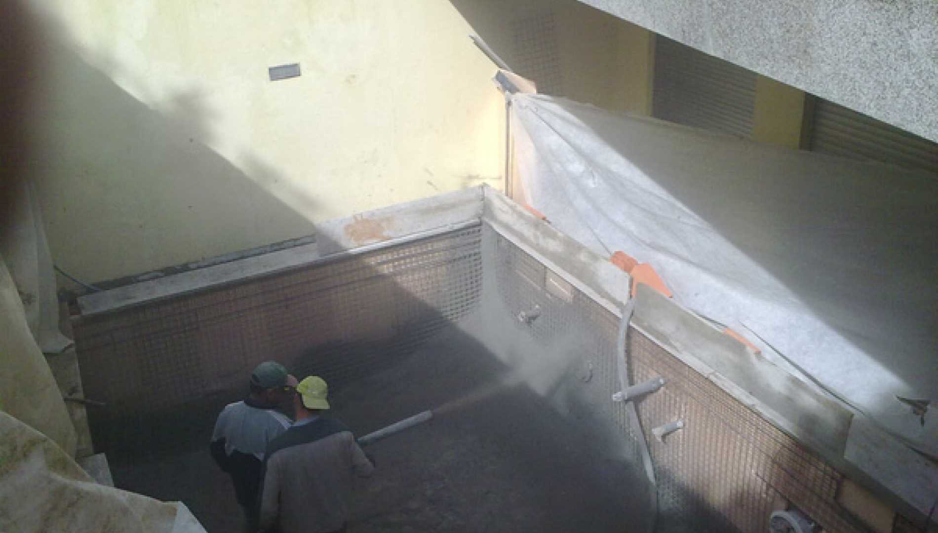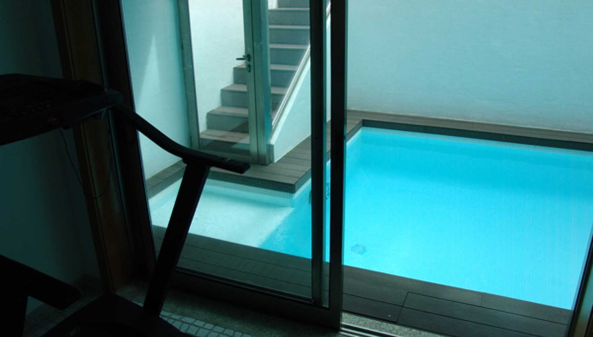 Piscina interior, construída em Betão Projectado, com 15 m2, de Skimmers. Revestimento a mosaico de vidro branco. Equipamento de filtragem e desinfecção Astralpool, com Bomba de Contra Corrente e um foco de iluminação.