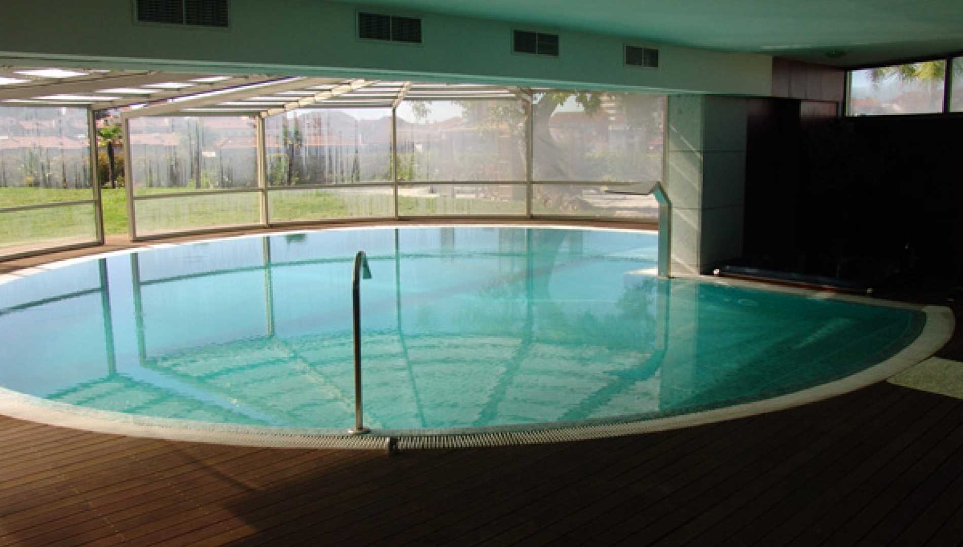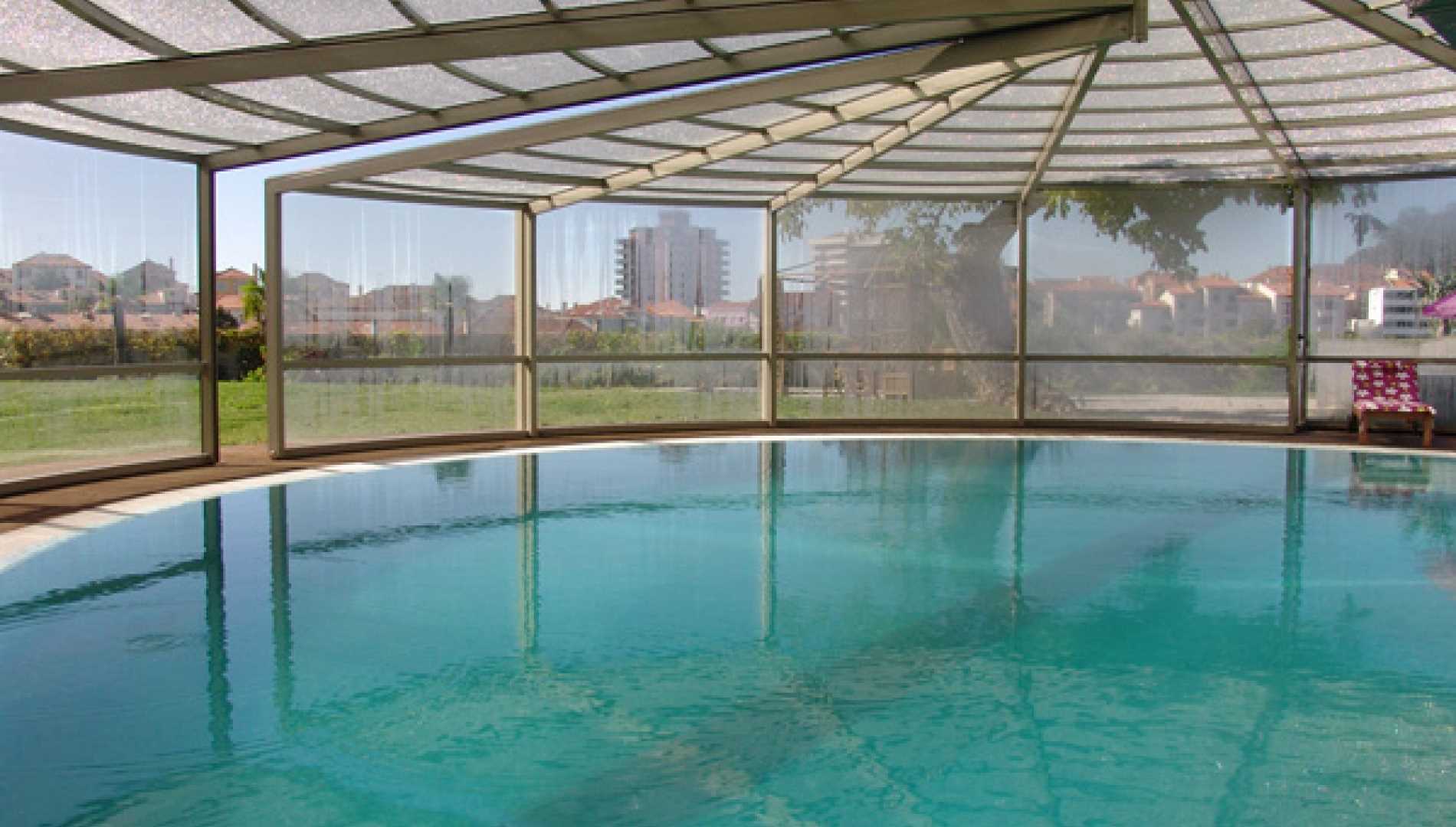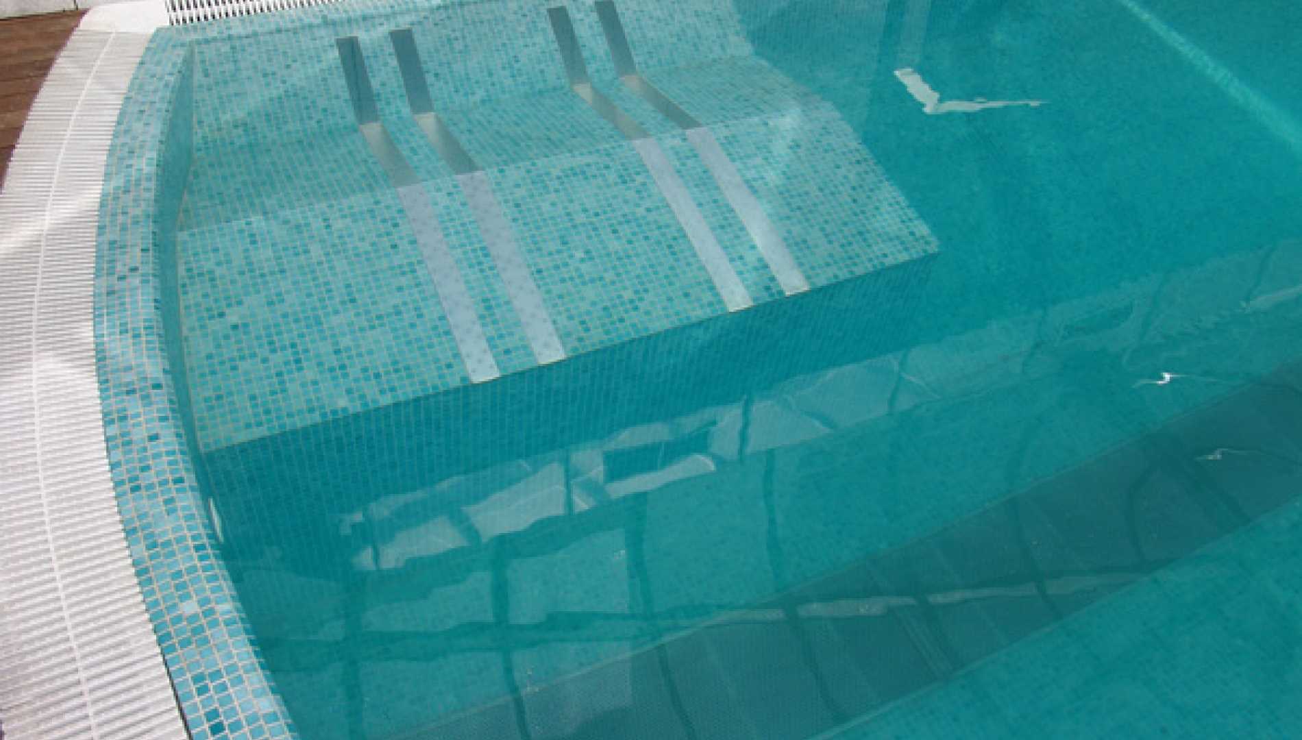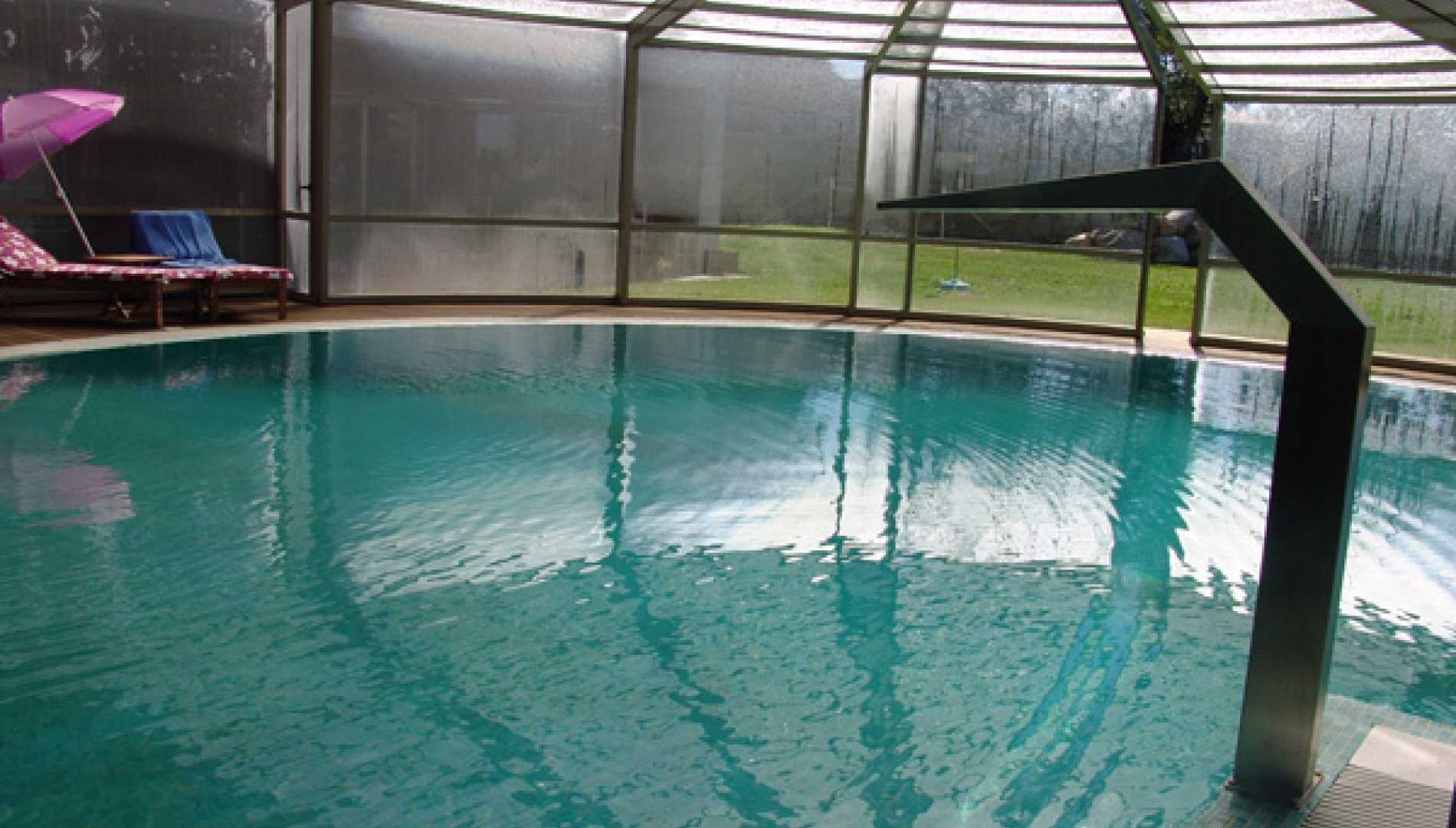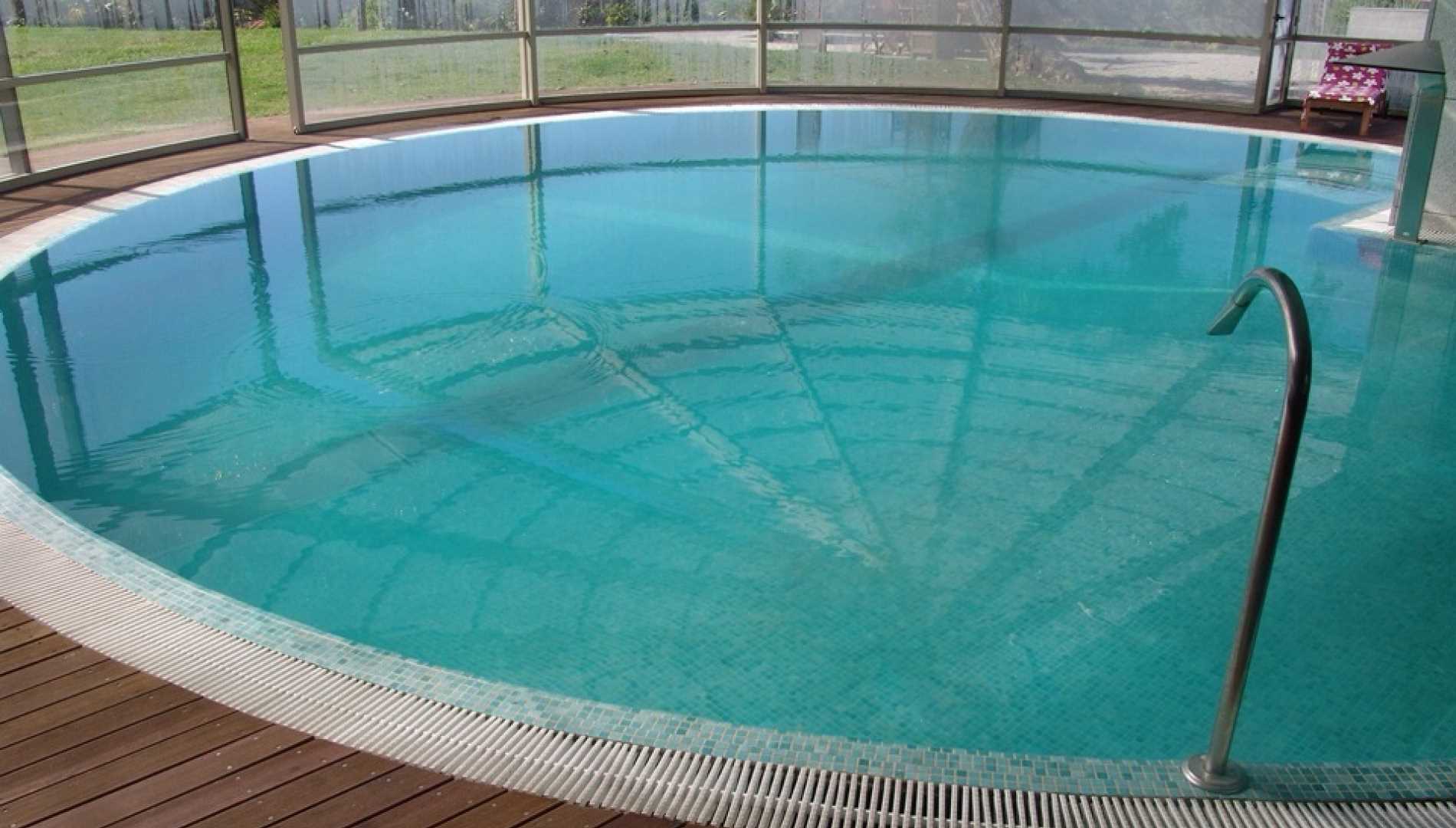 Piscina privada, construída em Betão Projectado, com 90 m2, de de transbordo por caleira finlandesa. Revestimento a mosaico de vidro azul mesclado. Equipamento de filtragem e desinfecção Astralpool, cama de hidromassagem incorporada e três focos de iluminação.