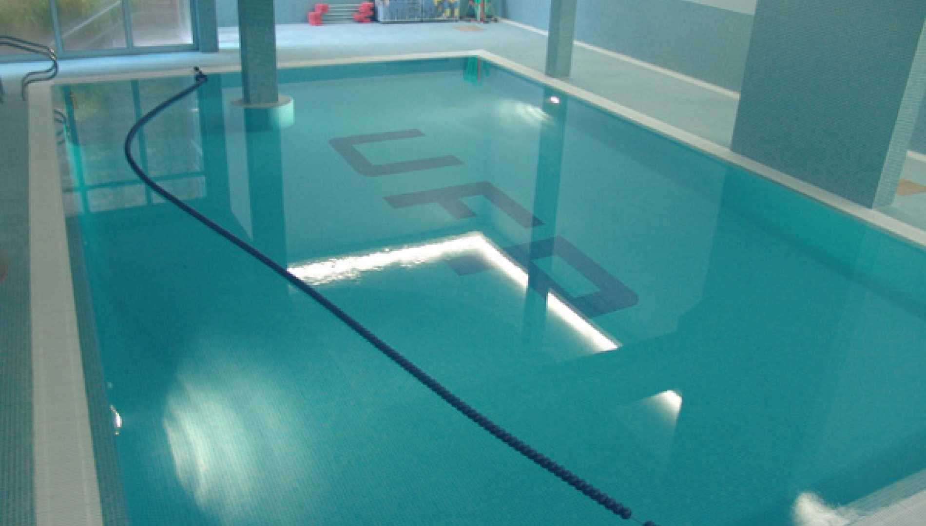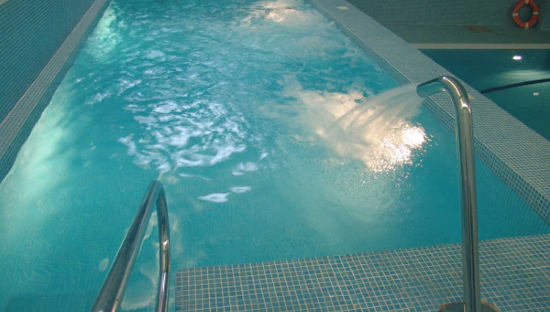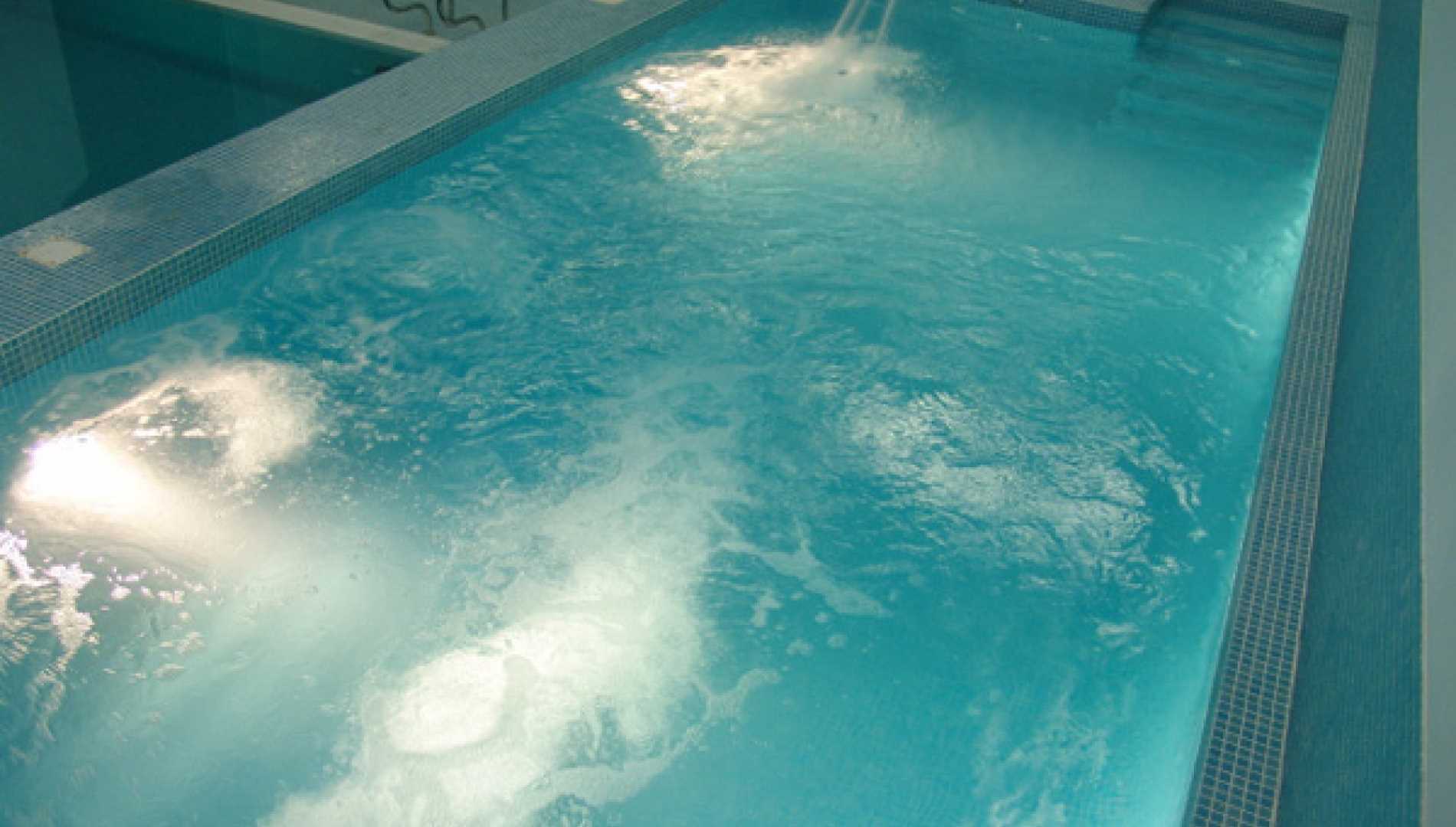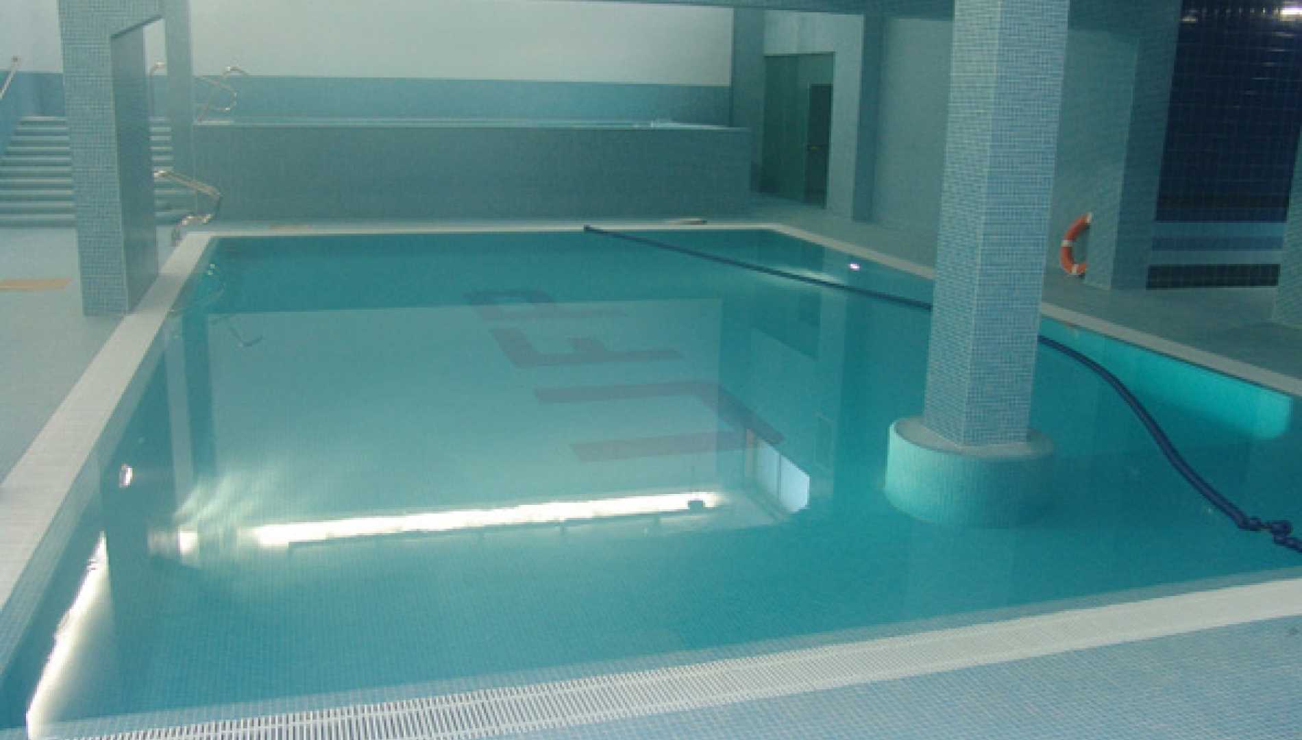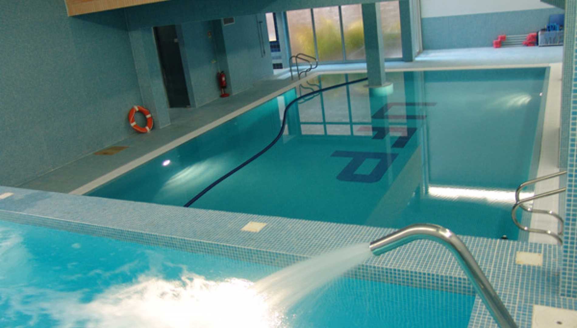 Piscina interior, construída em Betão Projectado, com 77 m2, de transbordo por caleira finlandesa e de água aquecida, tendo sido concebida para a tornar numa piscina de reabilitação. Revestimento a mosaico de vidro azul mesclado. Equipamento de filtragem e desinfecção Astralpool, com canhões de água, bomba de contra corrente, cascata e três focos de iluminação.