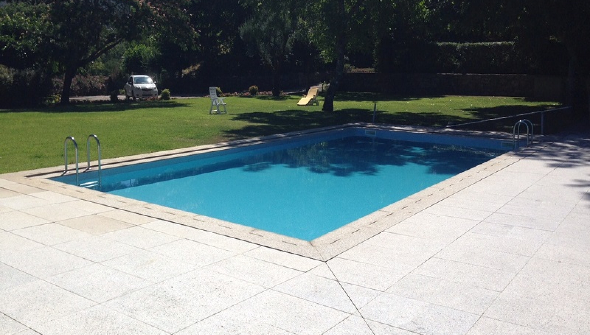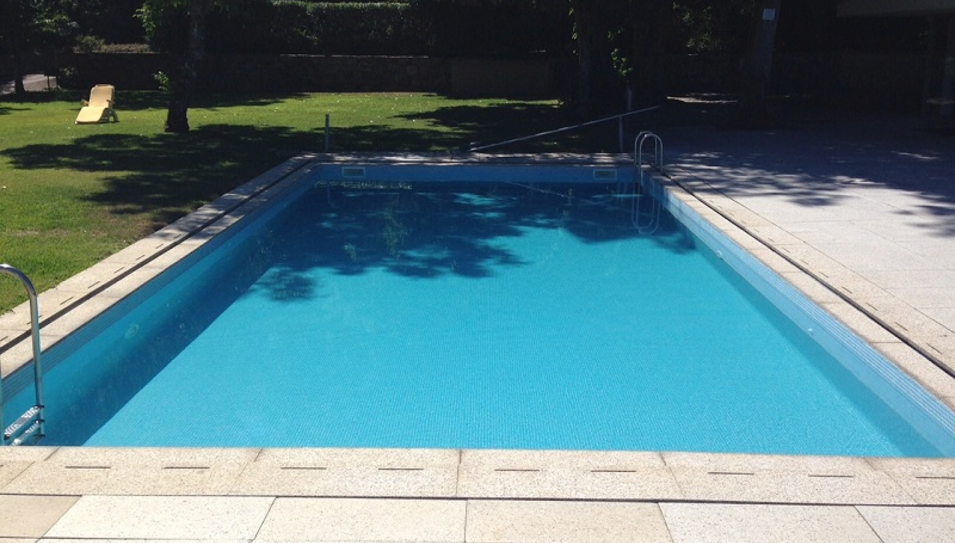 Piscina construida em betão projetado de skimmers, revestida a mosaico de vidro azul