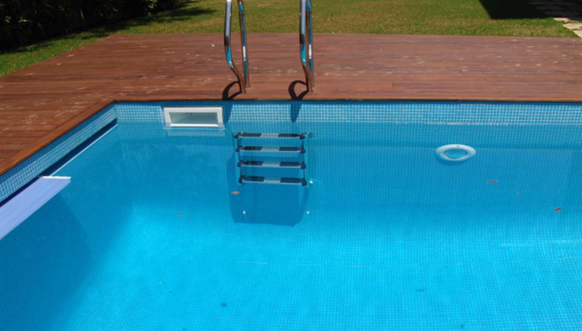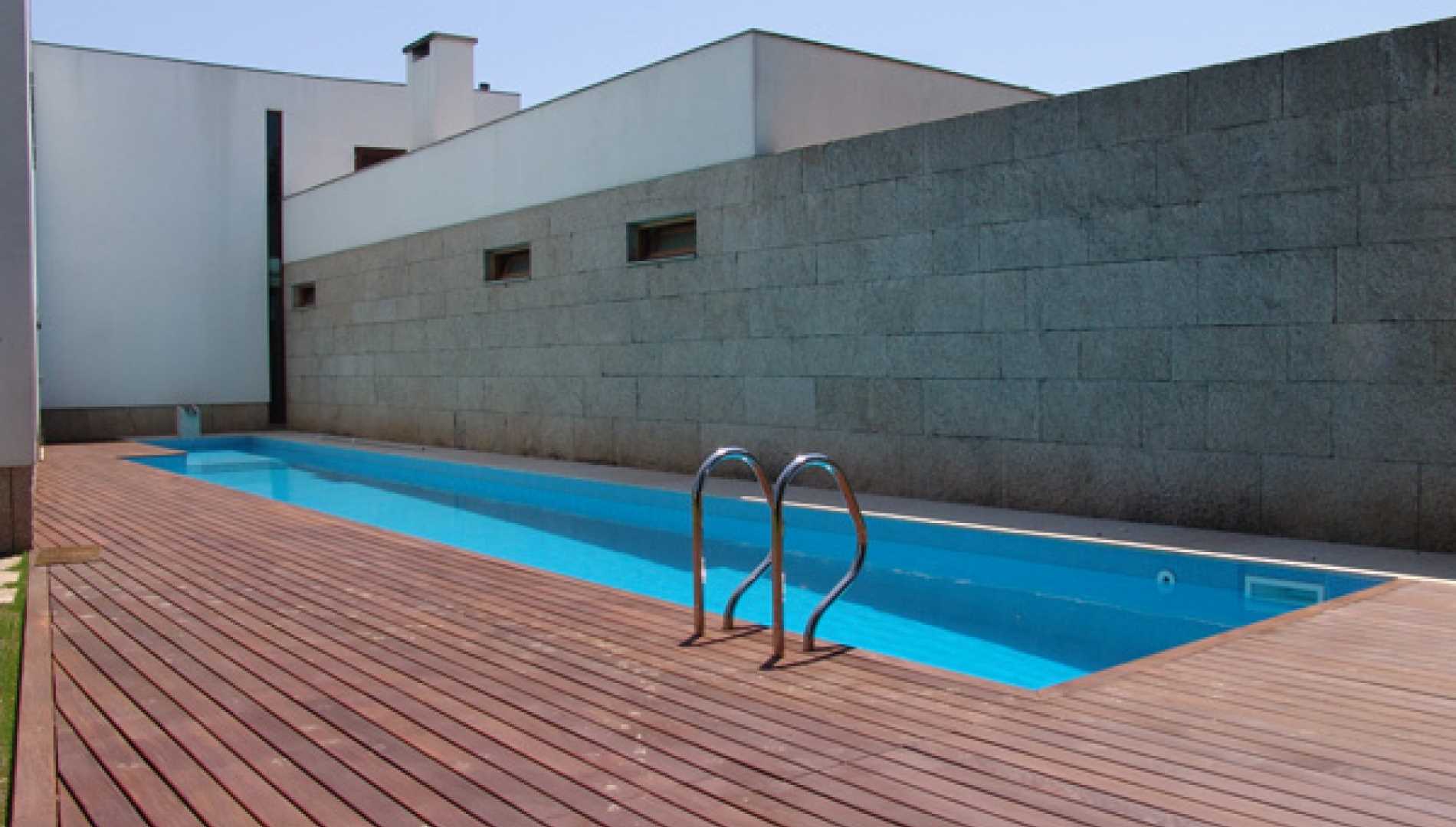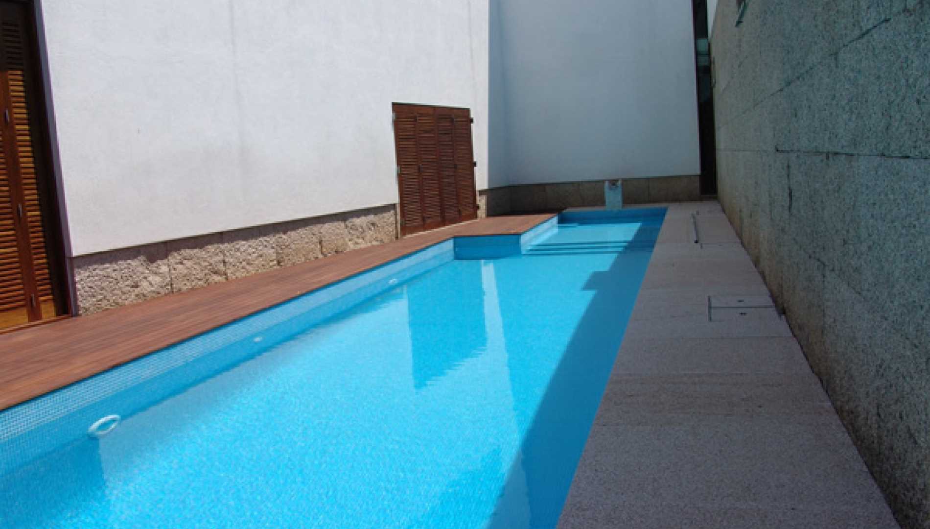 Piscina exterior privada, construída em Betão Projectado, com 54 m2, de Skimmers. Revestimento a mosaico de vidro azul, com escada em betão. Equipamento de filtragem e desinfecção com aparelho de sal Astralpool, três focos de iluminação e cobertura automática translucida.