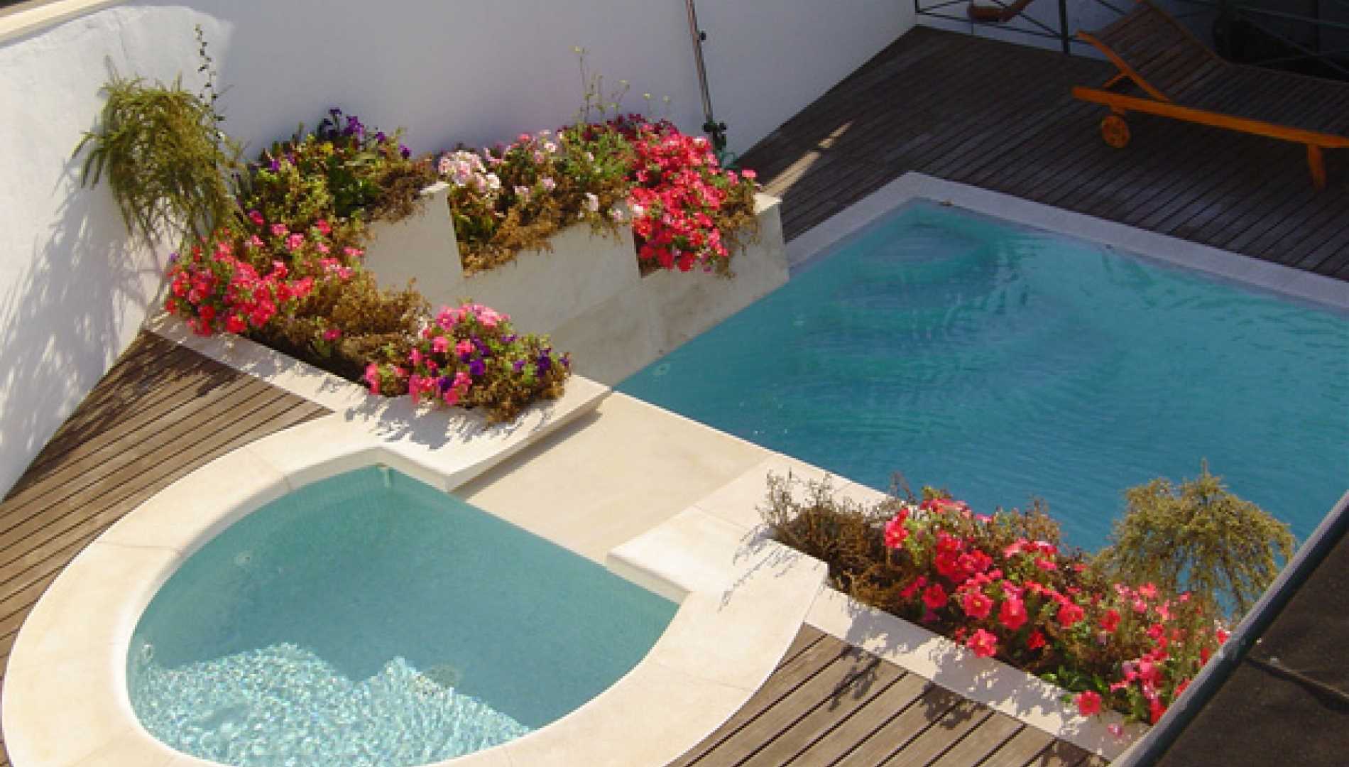 Piscina exterior privada, construída em Betão Projectado, com 20 m2, de Skimmers. Revestimento a mosaico de vidro azul, com escada em betão. Num patamar superior uma pequena piscina que oferece um efeito de cascata para a piscina num patamar inferior. Equipamento de filtragem e desinfecção Astralpool, dois focos de iluminação.