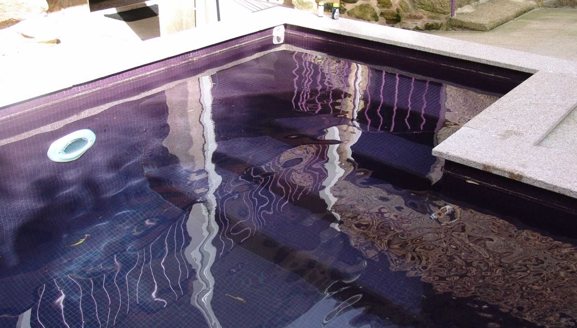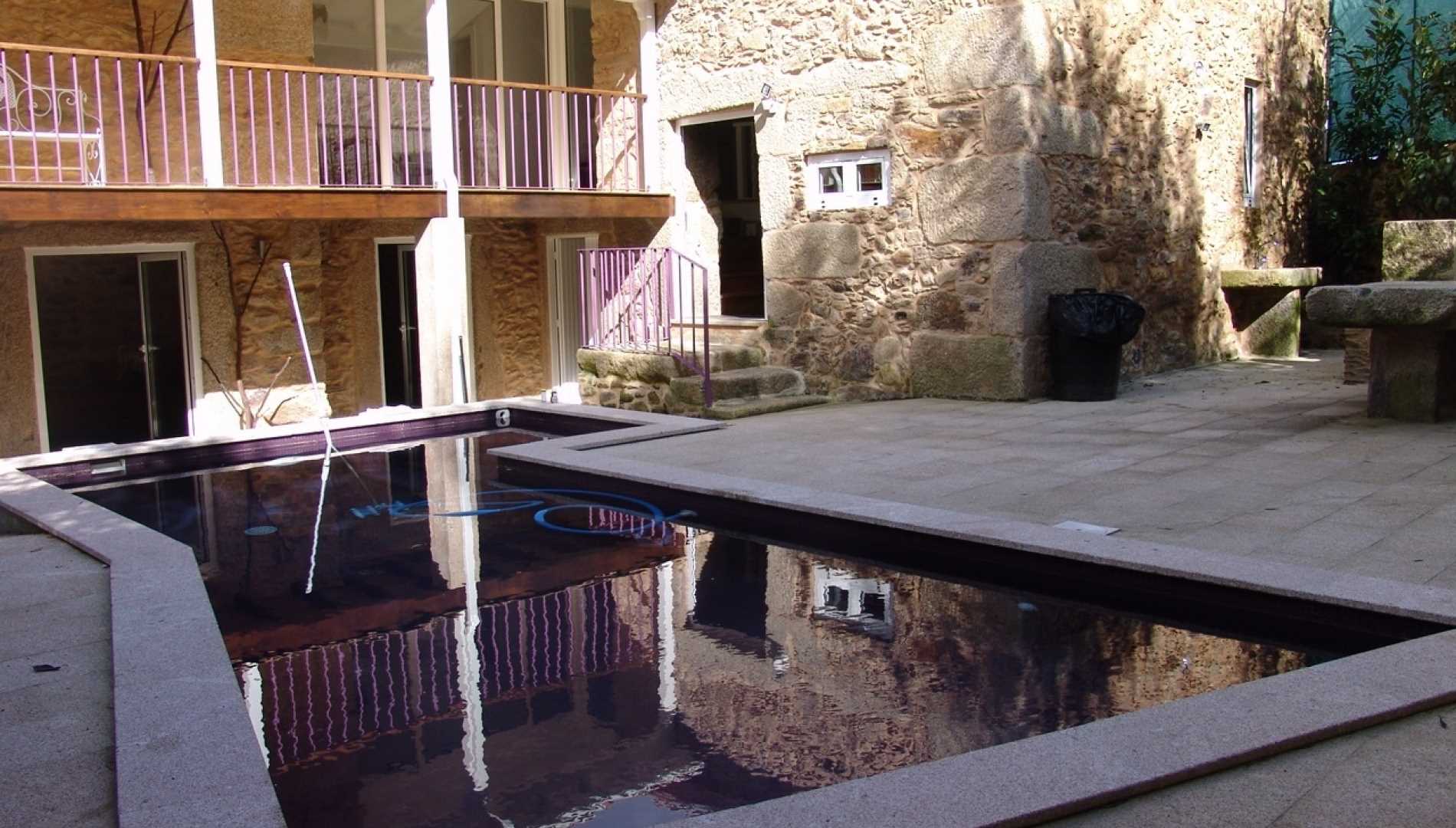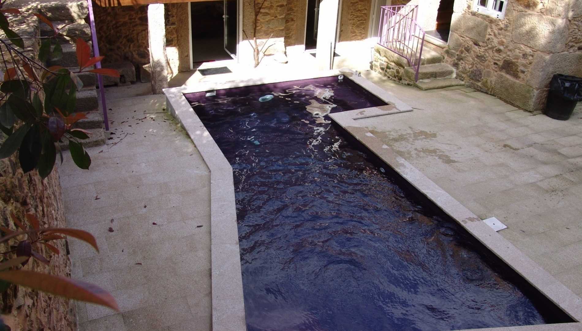 Piscina exterior privada, construída em Betão Projectado, com 32 m2, de Skimmers. Revestimento a mosaico de vidro violeta, com escada em betão. Equipamento de filtragem e desinfecção com aparelho de sal Astralpool, dois focos de iluminação.