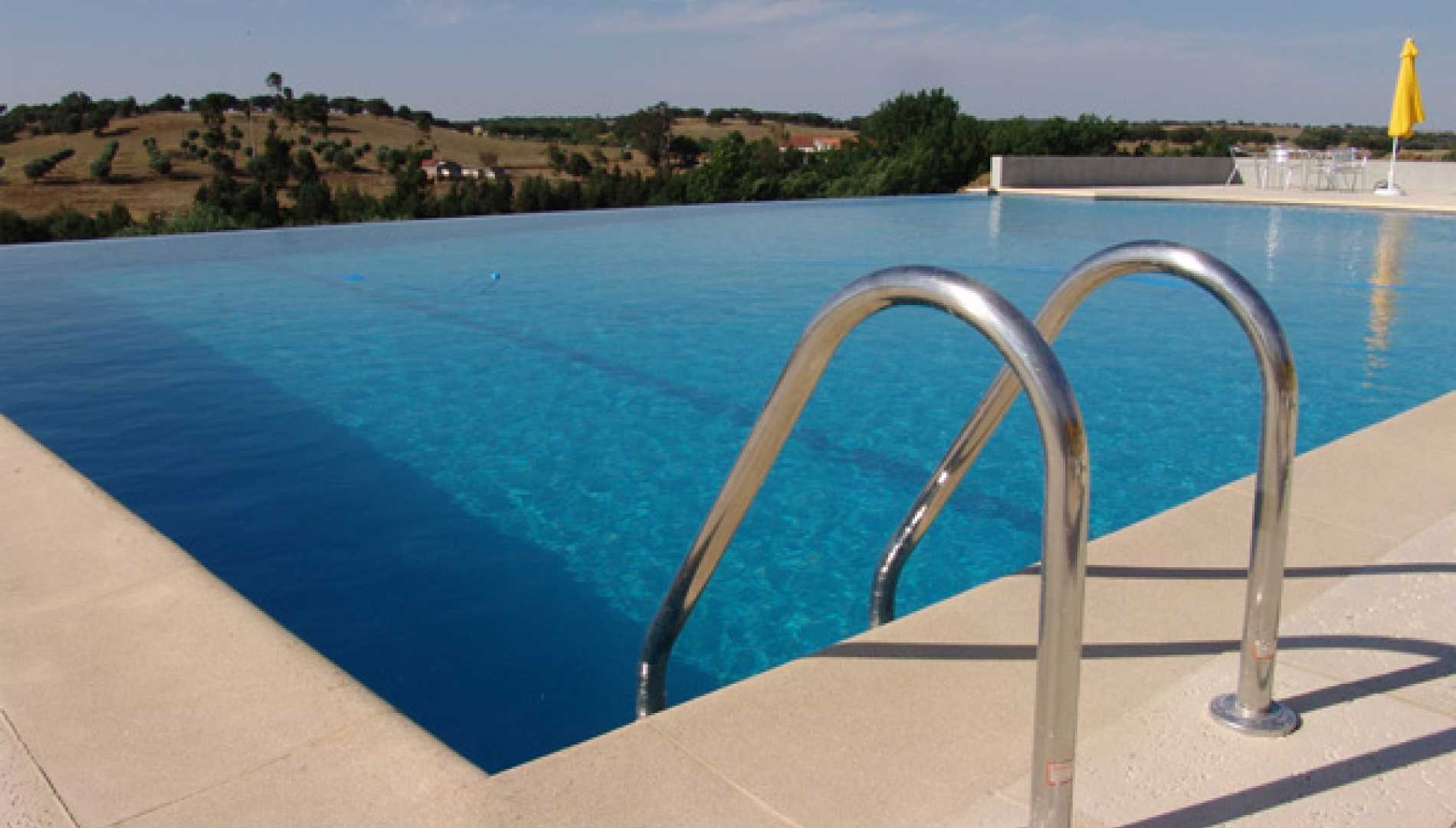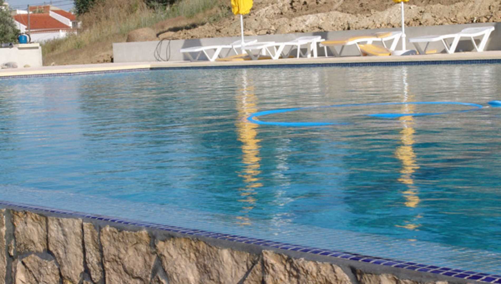 Piscina exterior, construída em Betão Projectado, com 50 m2, de transbordo numa lateral com tanque à vista. Com escada romana, e revestimento a mosaico de vidro. Equipamento de filtragem e desinfecção Astralpool, e dois focos de iluminação.