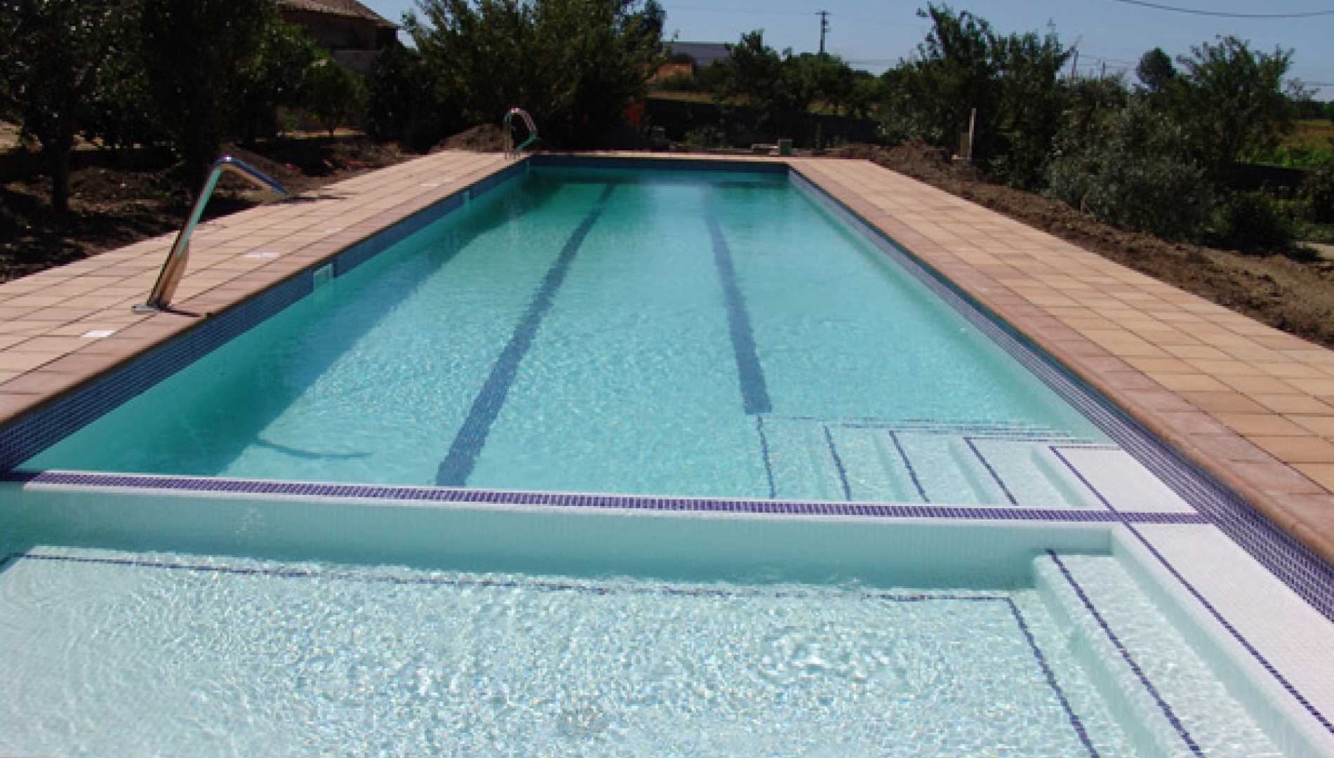 Piscina exterior privada, construída em Betão Projectado, com 56 m2, de Skimmers. Revestimento a mosaico de vidro mesclado, com escada em betão e zona de recreio para crianças. Equipamento de filtragem e desinfecção Astralpool, três focos de iluminação led multicolor e cobertura automática translucida.