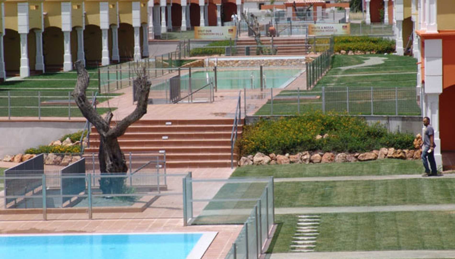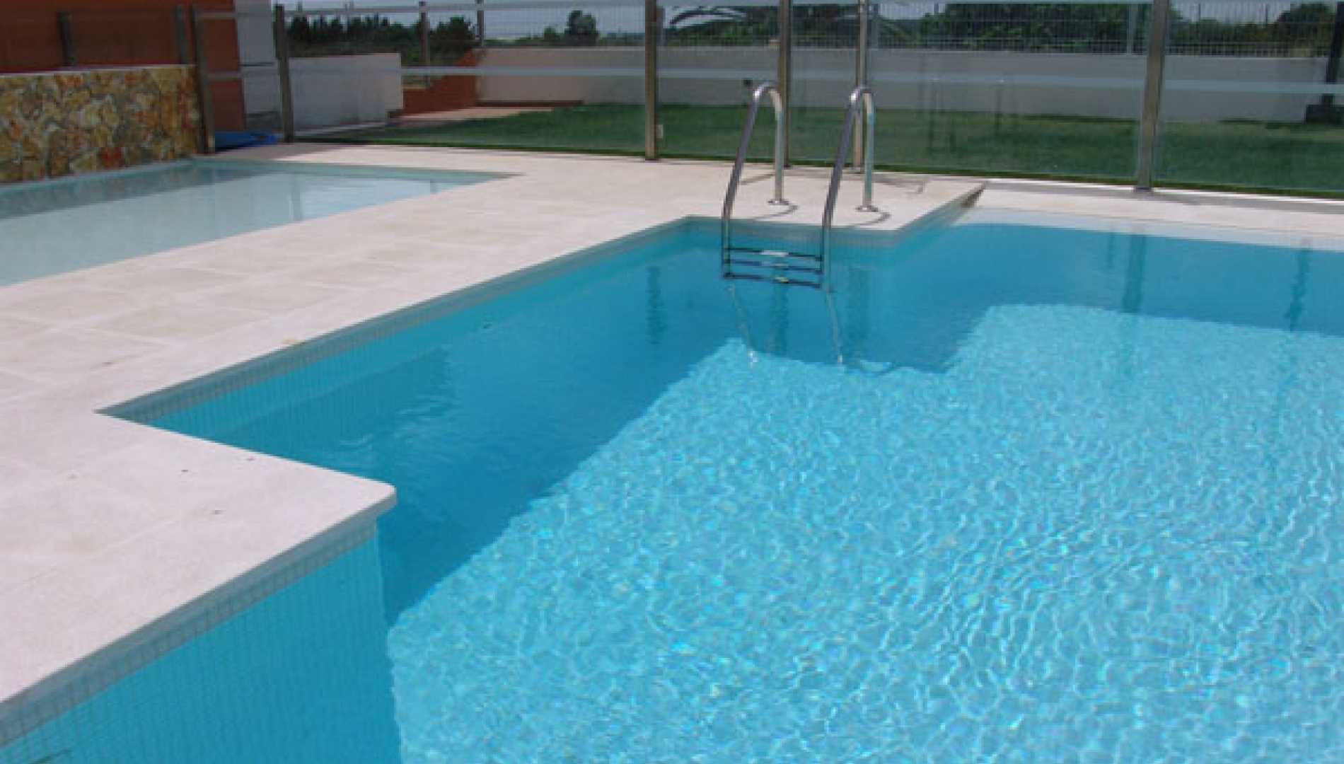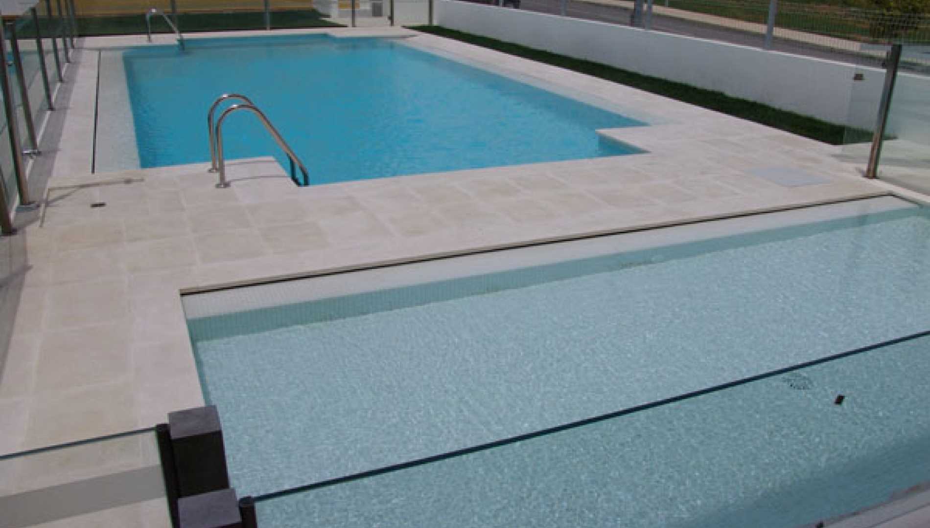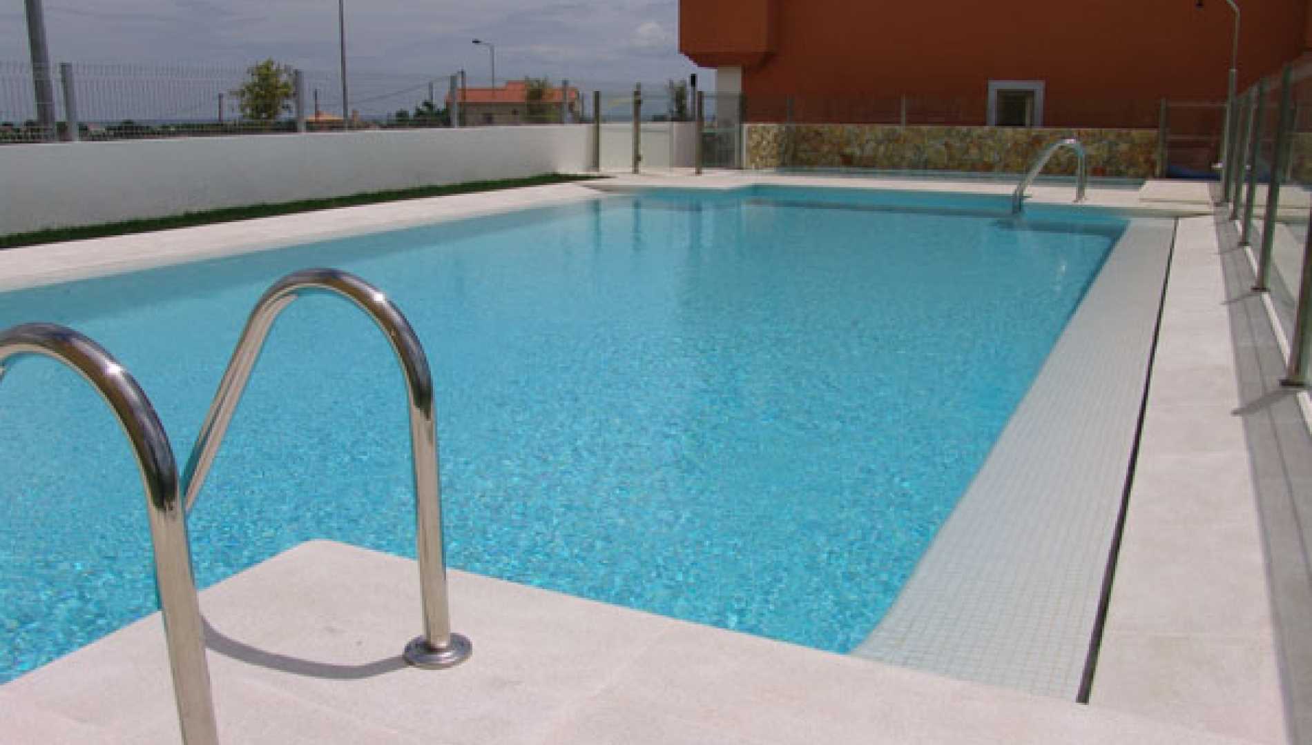 Conjunto de piscinas exteriores, construídas num complexo habitacional em Betão Projectado, de caleira finlandesa. Revestimento a mosaico de vidro branco, com escada em betão. Equipamento de filtragem e desinfecção Astralpool, quatro focos de iluminação.