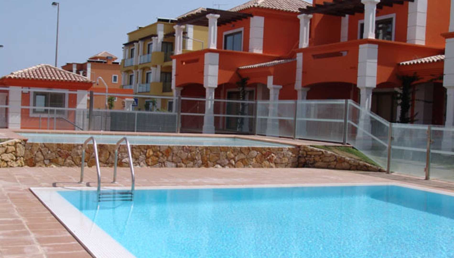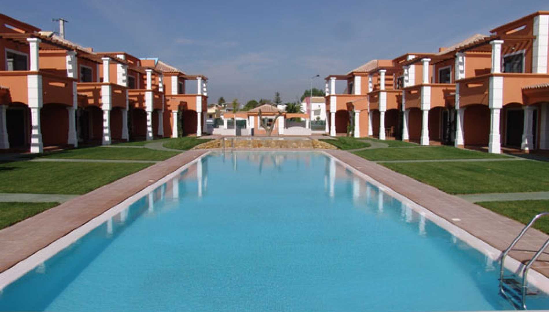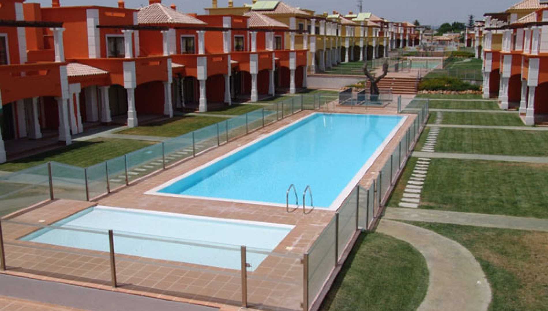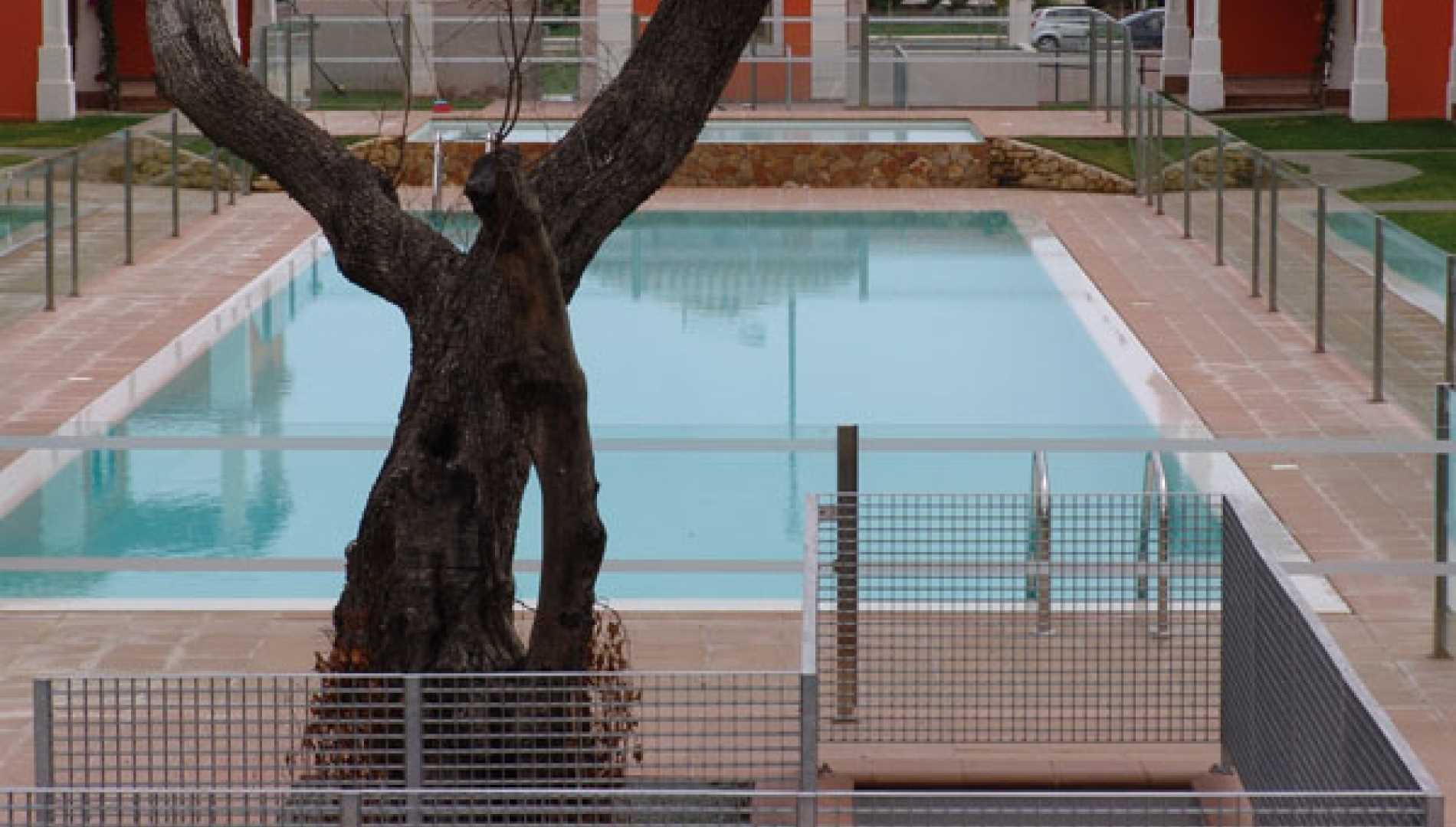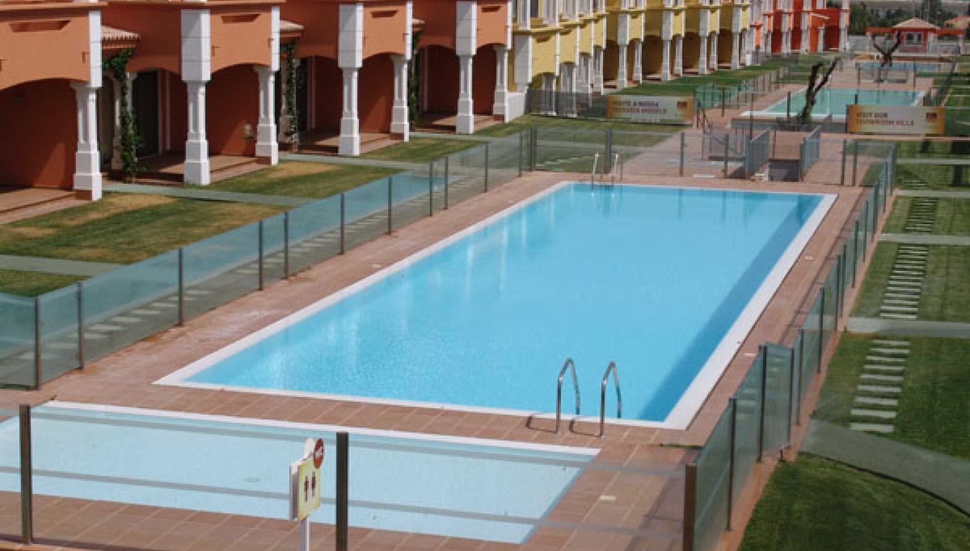 Conjunto de piscinas exteriores, construídas num complexo habitacional em Betão Projectado, de caleira finlandesa. Revestimento a mosaico de vidro branco, com escada em betão. Equipamento de filtragem e desinfecção Astralpool, quatro focos de iluminação.